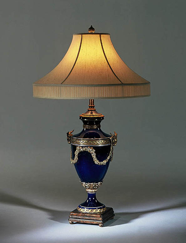 Cobalt urn with bronze mounts and hardwood base with hand sewn shade